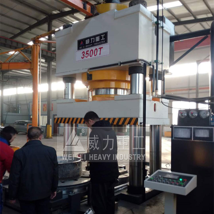 YW32-3500吨液压机_大型冲压拉伸机也叫四柱拉伸液压机,四柱冲压液压机,是山东威力重工液压机厂家生产的一台型号为YW32-3500T的液压机,这款液压机机身为三梁四柱结构,经济实用,液压系列采用二通插装阀;电器控制系统可配“PC”可编程序控制器,并有独立的电器及液压动力机构。采用按钮集中控制,可实现调整、手动及半自动操作方式,可实现定压和定程两种工艺方式。定压成型时,在压制后有保压延时及自动回程动作。工作台中间装有顶出装置,除顶出制品外。尚可作为液压垫用于反拉伸制件的成型工艺,其工作压力和行程,可根据工艺需要,在规定的范围内调节。